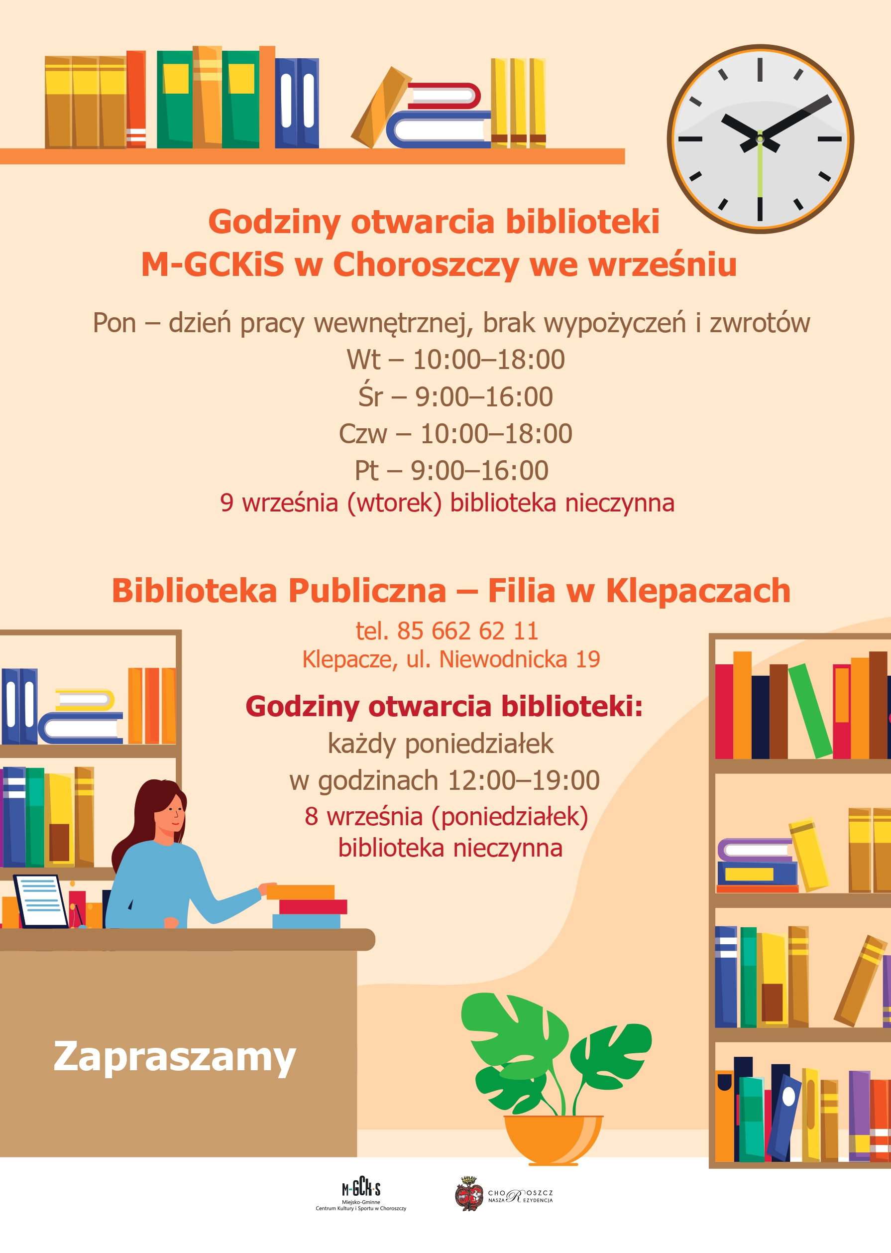 Wraz z nadejściem nowego miesiąca pragniemy przedstawić harmonogram pracy naszej biblioteki. Wszelkie szczegóły znajdują się na zamieszczonym plakacie. Informujemy, że 8 września Filia w Klepaczach będzie nieczynna, a 9 września biblioteka w Choroszczy będzie zamknięta. Prosimy o uwzględnienie tych zmian przy planowaniu wizyt.
